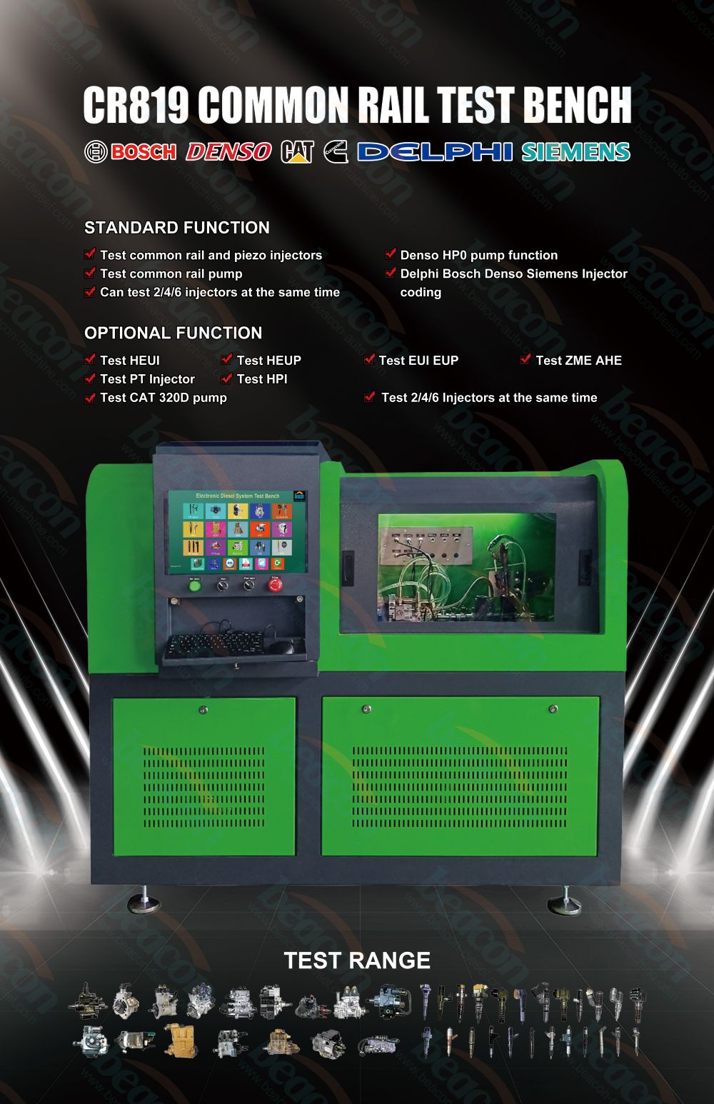 Испытательный стенд Common Rail CR819 может проверять все виды форсунок Common Rail и пьезоэлектрических форсунок, выполнять функцию кодирования форсунок, проверять все виды насосов Common Rail и насосов Denso HPO HP3 HP4, а также выполнять функцию тестирования форсунок EUIEUP и HEUI.