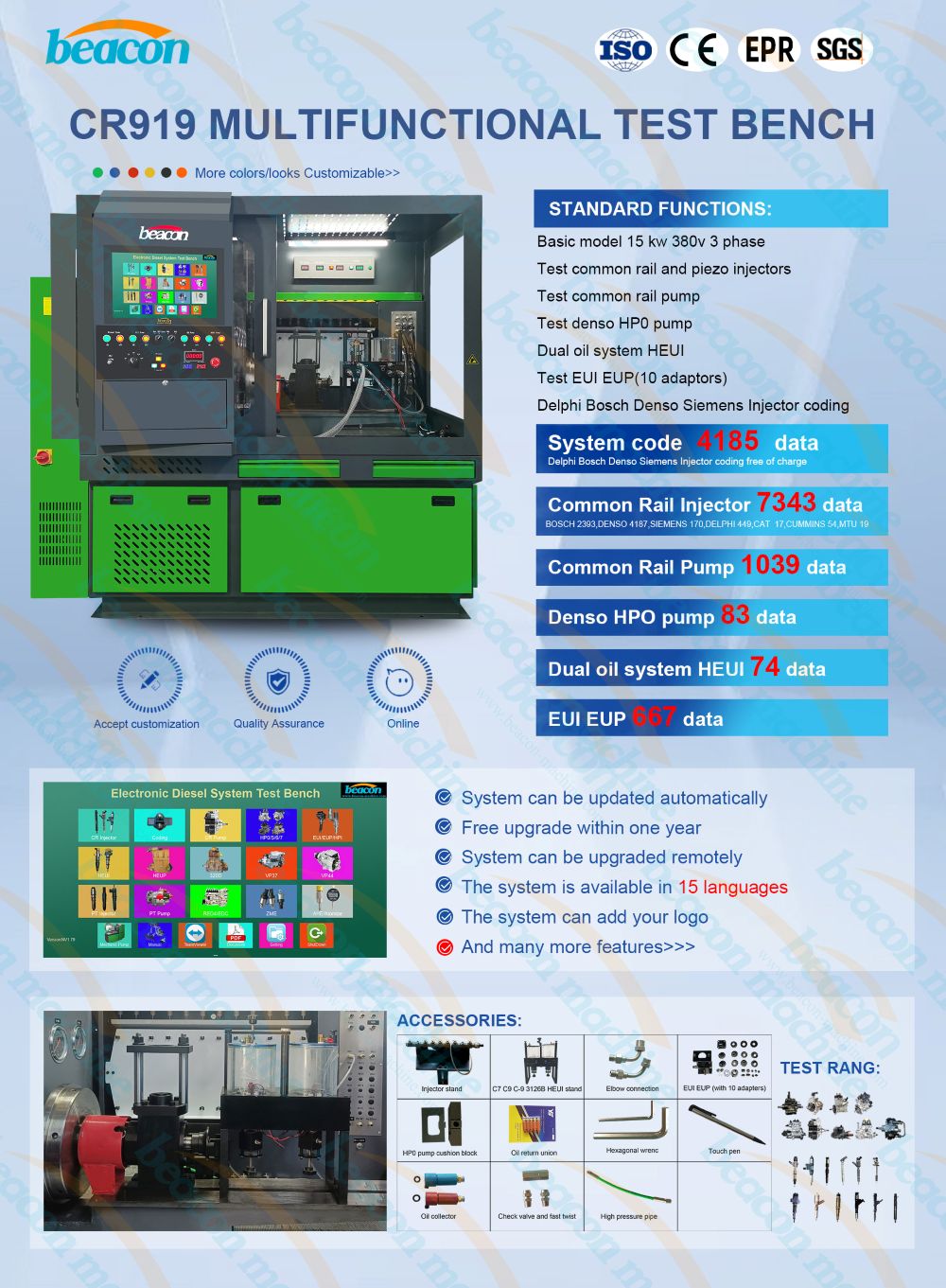 (2) Он может тестировать инжекторы с электромагнитным клапаном или пьезоэлектрическим кристаллом, насосы высокого давления Common Rail таких производителей, как Bosch, Delphi, Denso, Siemens, Caterpillar, Cummins, бытовой свежий воздух, Beiyou и тяжелое масло. (Примечание: некоторые функции опциональны)