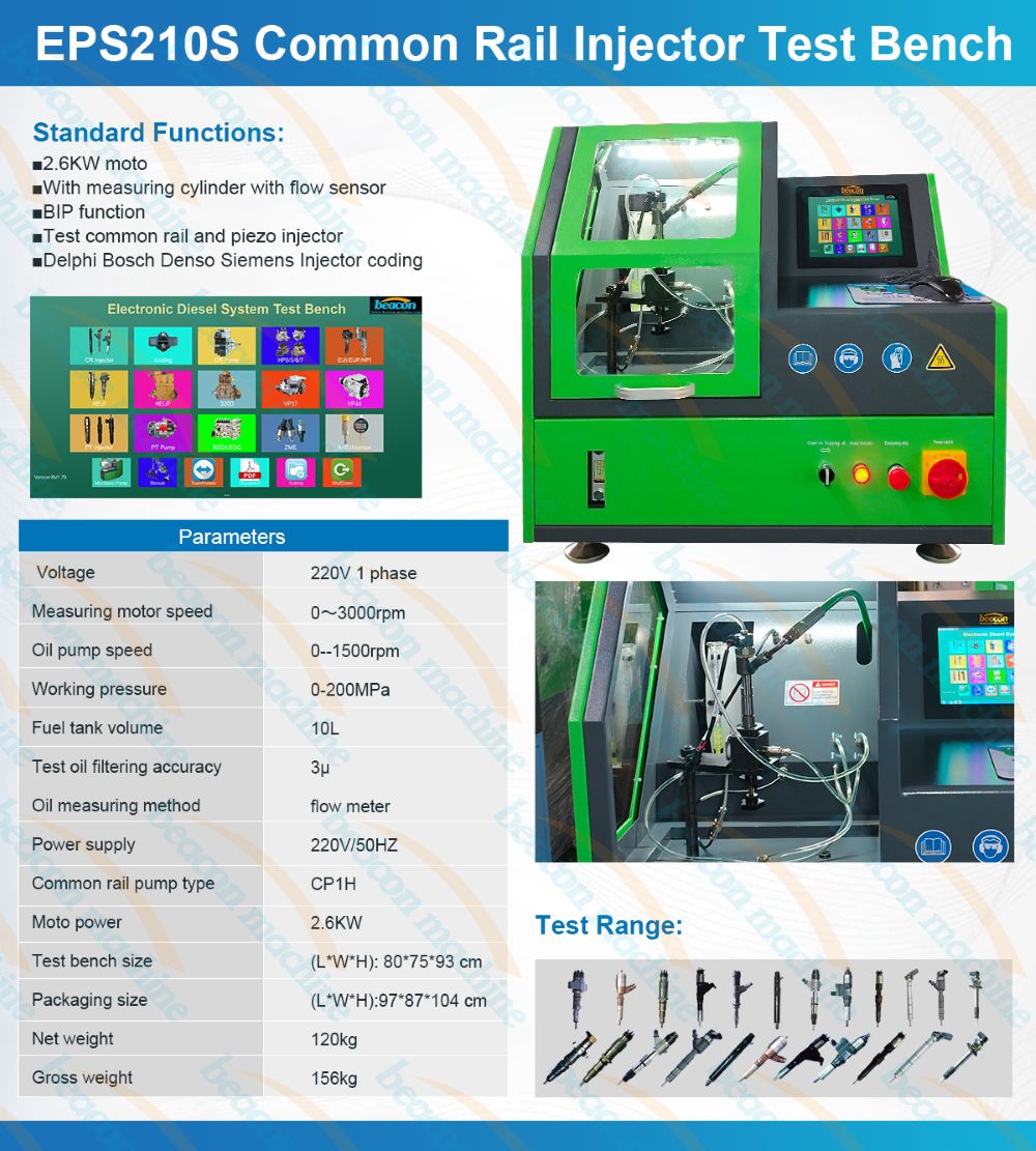 Испытательный стенд для дизельных форсунок EPS210S имеет две измерительные системы: датчик расхода форсунки и стеклянный колпачок. Он может проверять все виды форсунок Common Rail и пьезоэлектрических форсунок с помощью стеклянного колпачка или датчика расхода форсунки, а также может выполнять функцию кодирования форсунок и имеет функцию BIP.